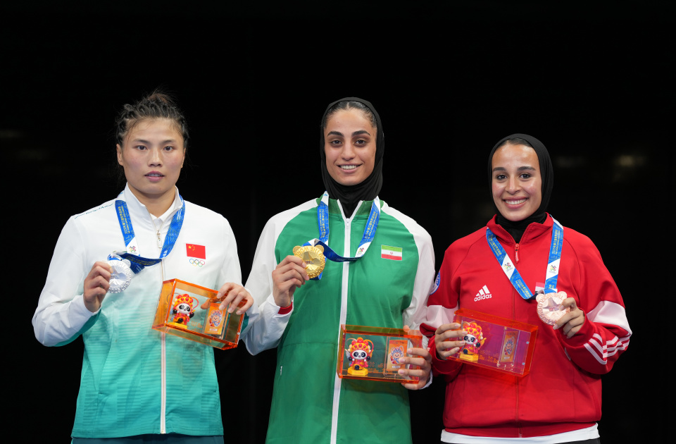 8月12日,冠军伊朗选手娅萨曼(中)、亚军中国选手朱海兰(左)和季军埃及选手阿里在颁奖仪式中。新华社记者 徐速绘 摄